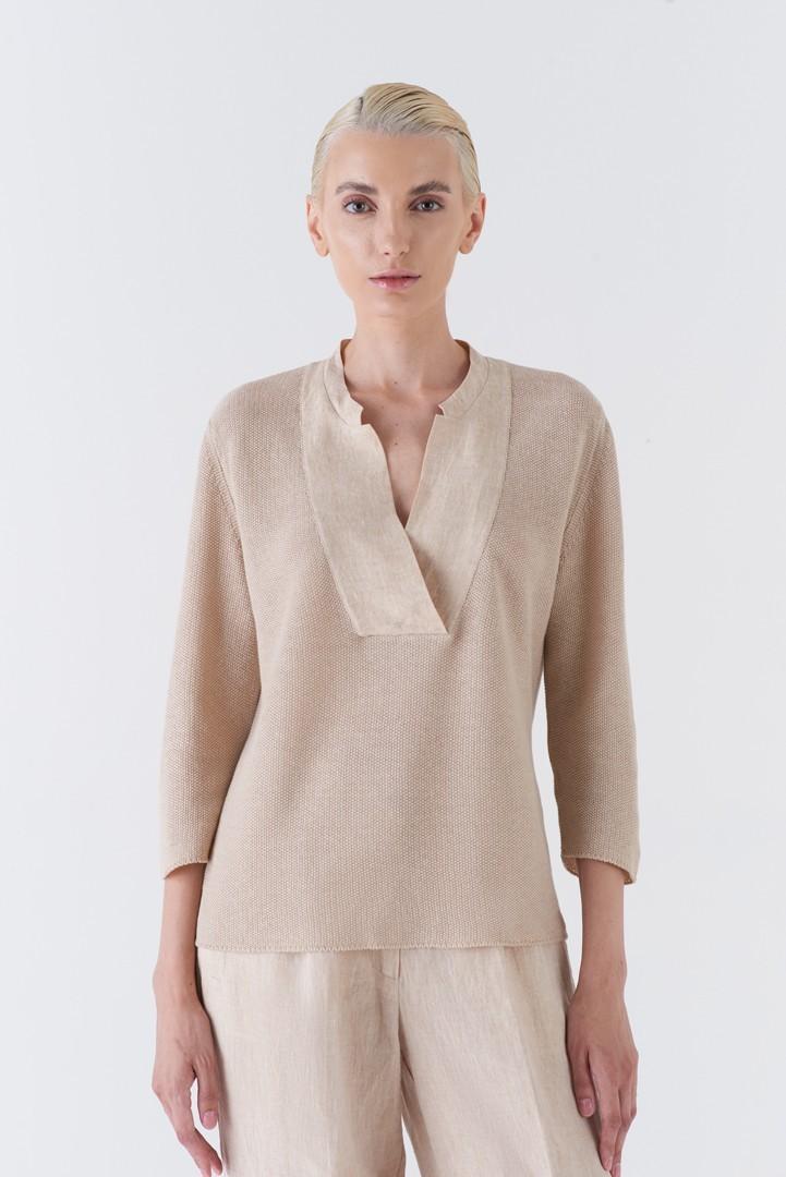 PULL IN LINO COTONE CON MANICA A TRE QUARTI E PLASTRON IN TESSUTO LINO