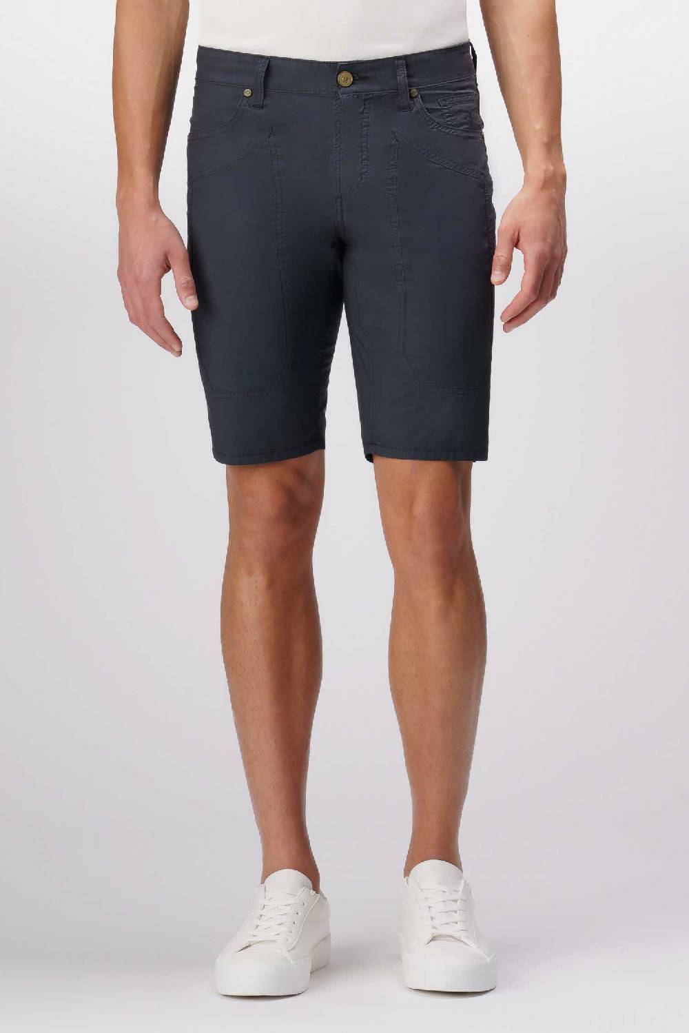 Bermuda 5 tasche con toppa slim fit blu scuro realizzato in tessuto tela paracadute, tessuto comfort e ultra – leggero. Il modello è tinto in capo con stone wash caratterizzato dalla personalizzazione di bottoni e rivetti loggati in galvanica colore ottone. Il capo ha cintura interna che riporta il nome e il fit del modello ricamati in tono con le cuciture e logo J ricamato sul taschino sinistro