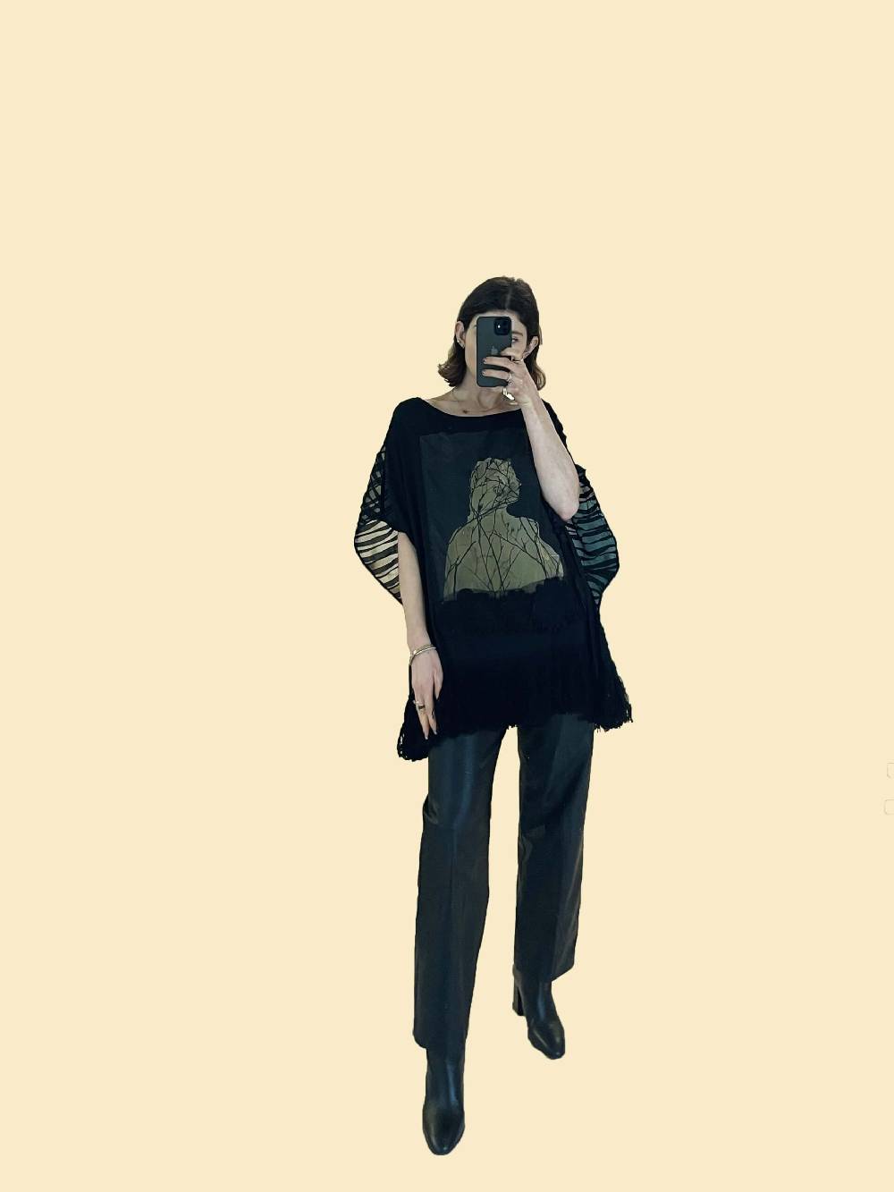 Ispirata agli anni 20, in collaborazione con l’artista Alessandra Calò, questa blusa è uno dei 6 pezzi unici della serie Secret Garden, che presenta ritratti femminili tratti da lastre fotografiche originali che vanno dal fine 800 agli anni 30.Stampata su chiffon di seta, l’immagine rappresentata è quella di Nora.Per questa blusa sono stati utilizzati:chiffon di seta, georgette e un crepon di seta lavorato a pieghe cucite, finito con una frangia di lana merino.Sul retro: una piccola etichetta che riporta la frase iniziale, tratta dal testo della scrittrice Giulia Maria Falzea,che si riceve integrale insieme alla blusa.Una piccola opera d’arte da indossare. Veste dalla 40 alla 46.Pezzo unico.Qui il comunicato stampa della mostrahttps://www.culturaliart.com/eventi/maison-laviniaturra-presenta-la-mostra-di-alessandra-calo-secret-garden-in-occasione-di-arte-fiera-2024/?utm_source=newsletter&utm_medium=email&utm_campaign=mailup
