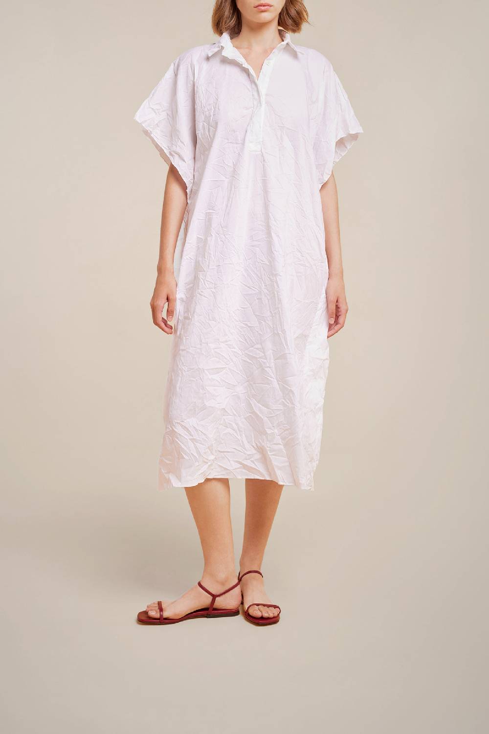 Abito midi in popeline stretch effetto crinkle, scollo a polo, giromanica basso, modello dritto con spacchi laterali al fondo.