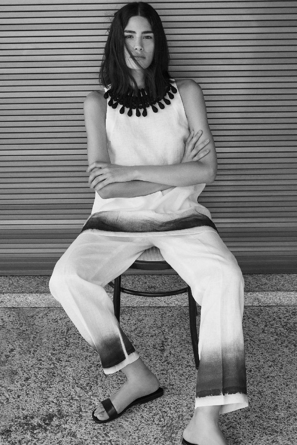 Pantalone in 100% lino con stampa handmade sfumato al fondo, patta davanti con chiusura zip, gancio e contro bottone, passanti in vita, tasche lungo i fianchi, piega stirata al centro davanti.