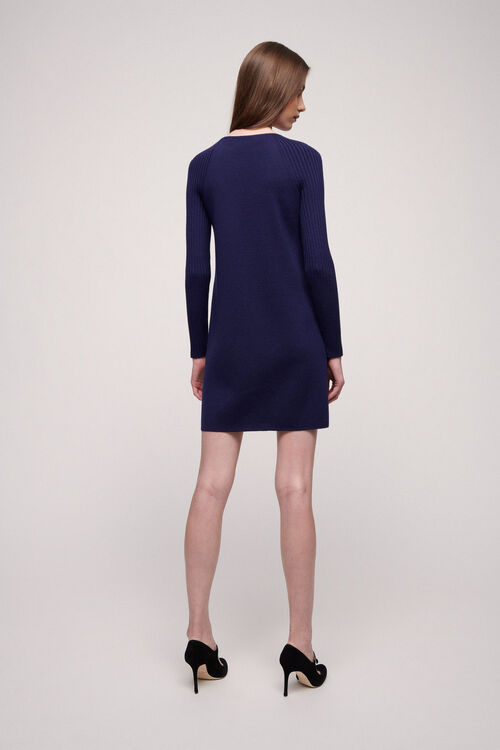 Abito con collo tondo in pura lana vergine lavorato con trama tecnica a punto di stoffa. Il capo è caratterizzato da maniche lunghe e tasche a toppa in vita lavorate a coste e da bottoni tondi in metallo dorato con logo LS posizionati in obliquo sulle cuciture delle spalle sul davanti. Lunghezza sopra al ginocchio. Vestibilità regolare.