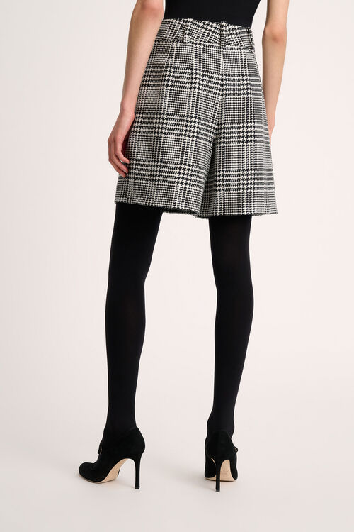 Bermuda a vita alta in lana fantasia pied-de-poule. Chiusura mediante zip e gancetto, passanti per cintura, riprese in vita. Lunghezza sopra al ginocchio. Vestibilità regolare.