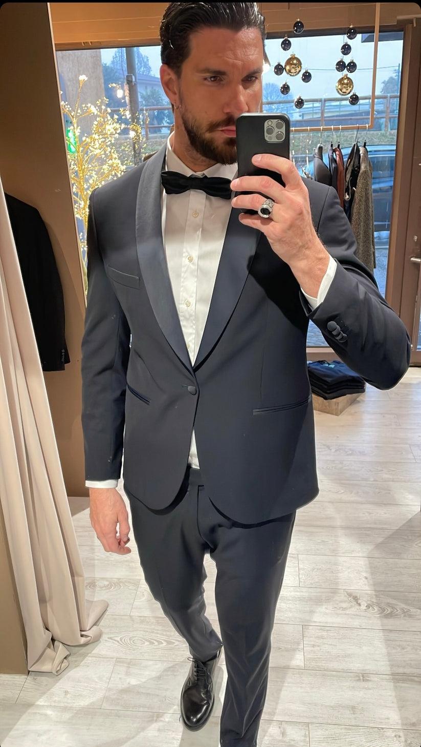 Giacca doppio petto destrutturata, smanicata, 4 bottoni in pasta nera, veste over, tessuto morbido. Il modello è alto 191 cm e pesa 91 kg indossa una taglia 3