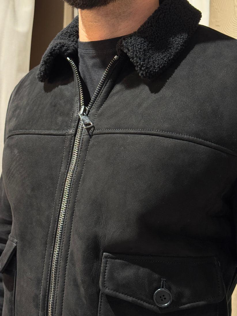 Montone nero sherling, con zip, veste silm, tasca toppa applicata, polsini su maniche e fondo Il modello è alto 191 cm e pesa 91 kg indossa una taglia 52